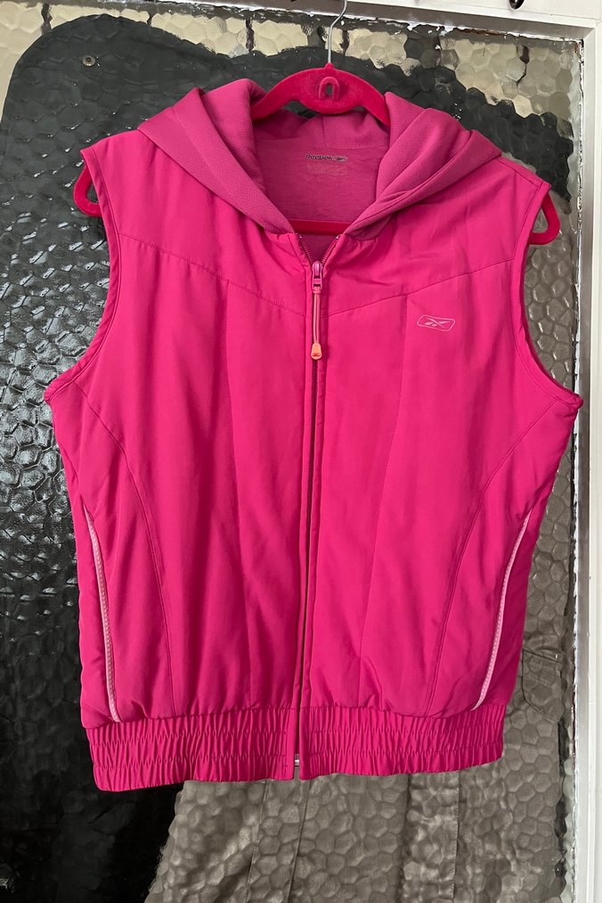 Reebok marka siklemen pembe renk, kapüşonlu önü ve yan cepleri fermuarlı şişme yelek. M beden. Sayılı giyildi, yeniden farksız. Ölçüleri iki koltuk altı arası 50 cm, en alt lastikli kısım 40cm, boy 58cm.