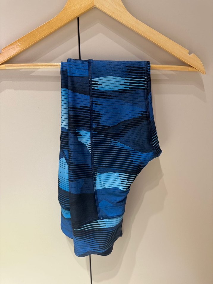 Sentetik kumaştan, pilili detaylı, mavi tie-dye desenli ve vücuda oturan tayt. Spor ve sokak modasına uygun. ♀️