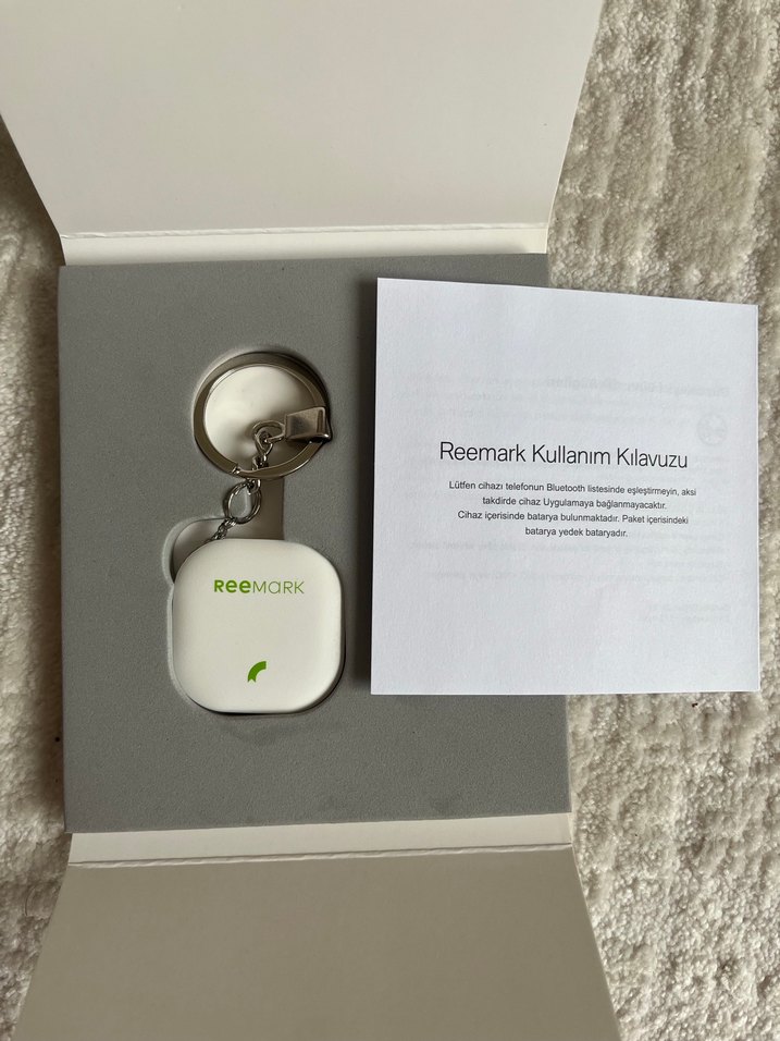 Minimalist beyaz renkte, zincir detaylı anahtarlık. Üzerinde "Reemark Kullanım Kılavuzu" yazılı kullanım kılavuzu ile birlikte gelir.