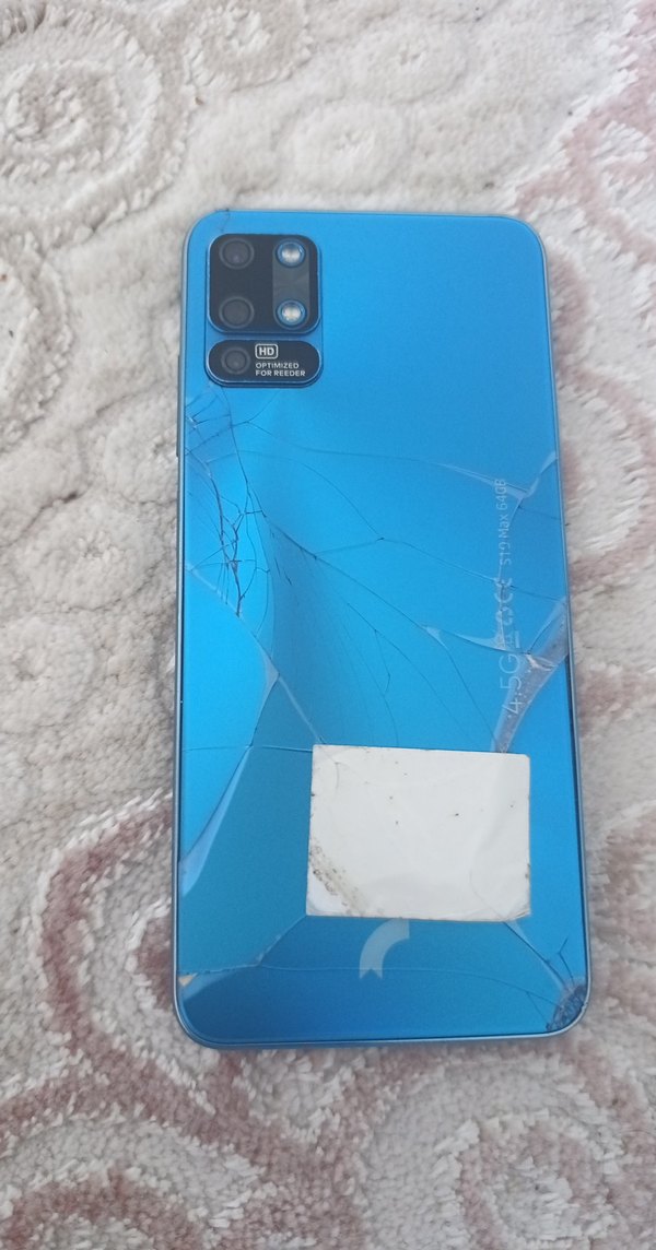 Çoklu arka kameralı, parlak mavi renkte, arka kapağı çatlamış Android telefon .