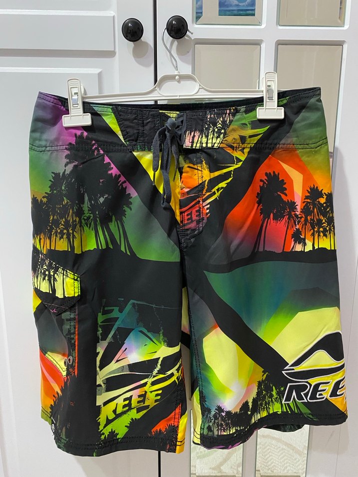 Erkek deniz spor şort/ renkli/ beli lastikli/ 34 beden/ REEF marka/ iyi durumda/ beli 44 cm boyu 54 cm Canlı tie-dye desenli, kemerli, rahat kesim erkek mini şort. Plaj temalı grafikler ve sokak stili sunar.