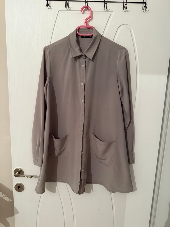 Refka marka gömlek tunik. 2 cebi mevcut. Normalde boyu çok uzundu ben terziye kestirdim. Çok az giymişimdir. Akışkan bir kumaşı var asla kırışmıyor. Normalde fotoğraftakinden daha açık gri