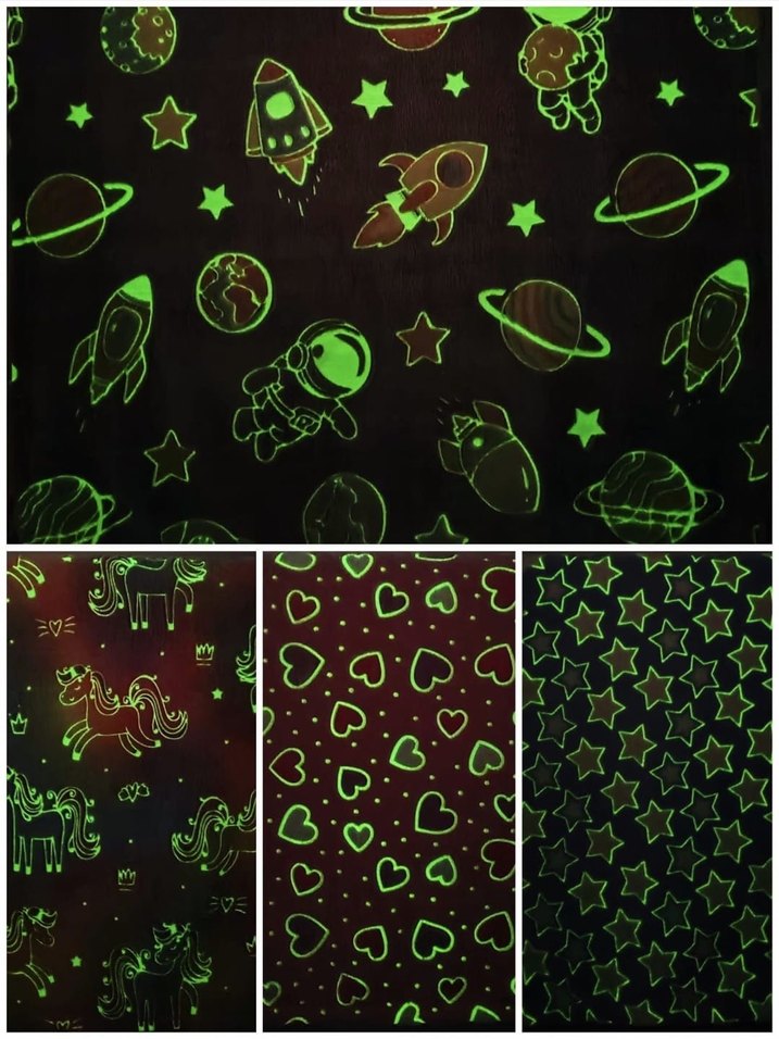 Karanlıkta parlayan, pegasus desenli çok renkli sentetik kumaştan çocuk battaniyesidir