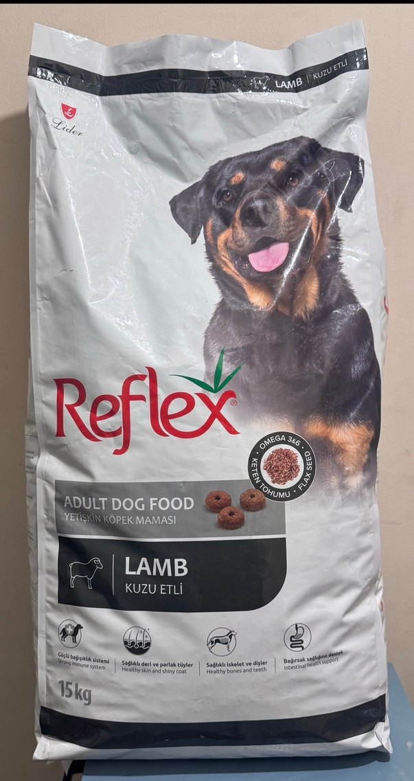 Reflex kuzu etli yetişkin köpek maması sağlıklı deri, parlak tüyler, güçlü kemikler ve sindirimi destekler .ambalaj deforme
