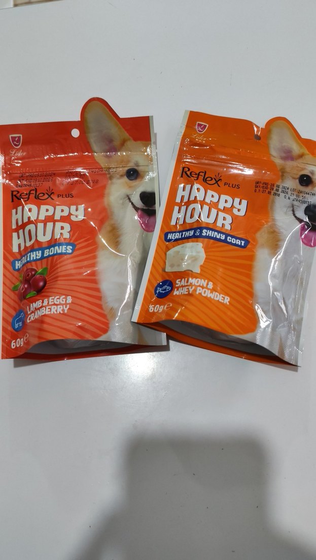 Reflex Plus Happy Hour köpek ödülleri, Kuzu & Yumurta ile Cranberry ve Somon & Whey Tozu olmak üzere iki lezzette sunulur. Her paket 50g olup sağlık ve parlak tüyler için uygundur. Skt 10.26 ve 08.26 Adet fiyatidie