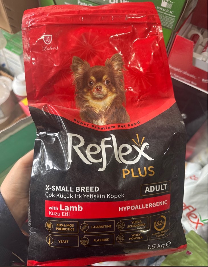 Reflex Plus, çok küçük ırk yetişkin köpekler için kuzu etli, hipoalerjenik mama. Prebiyotik, maya, keten tohumu ve peynir altı suyu tozu içerir. 1,5 kg.