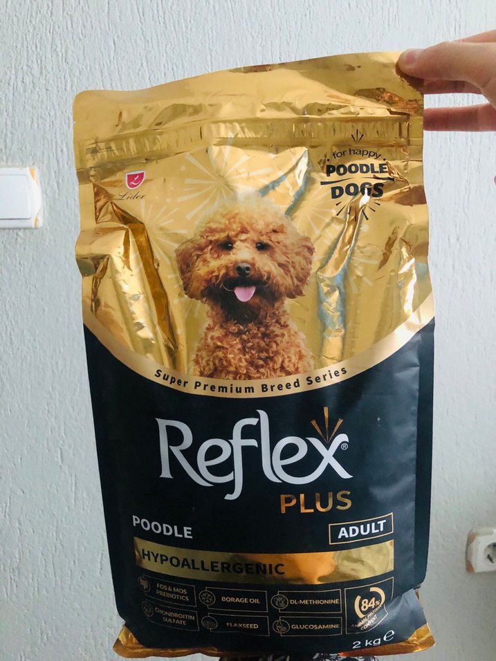 Reflex Plus yetişkin poodle köpekler için hipoalerjenik mama, keten tohumu, balık yağı ve glukozamin içerir, dengeli beslenme sağlar.