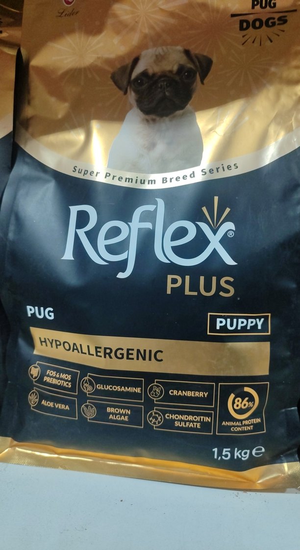 Reflex Plus Pug yavru köpek maması, %86 hayvansal protein içerir ve hipoalerjeniktir. Glukozamin, kızılcık, kondroitin sülfat, aloe vera, kahverengi alg ve prebiyotikler içerir.