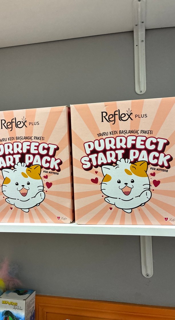 Pastel camel renklerde Reflex Plus yavru kedi başlangıç paketi, sevimli kedi çizimiyle yavru kediler için hazırlandı. 320 tl fiyatı var
