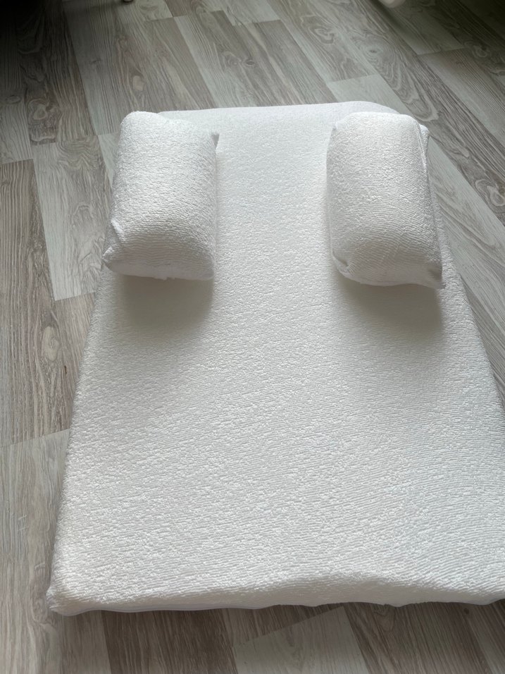 Yumuşak dokulu beyaz yastık ve minder seti, rahatlık ve destek sağlar. Set, düz taban minderi ve iki silindirik yastıktan oluşur. ️