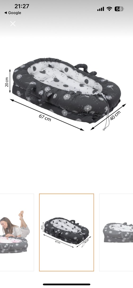 Siyah ve gri renklerde, desenli sentetik kumaştan yapılmış 67 cm uzunluğunda bebek yatağı. Taşıma kulpları bulunmaktadır. ️