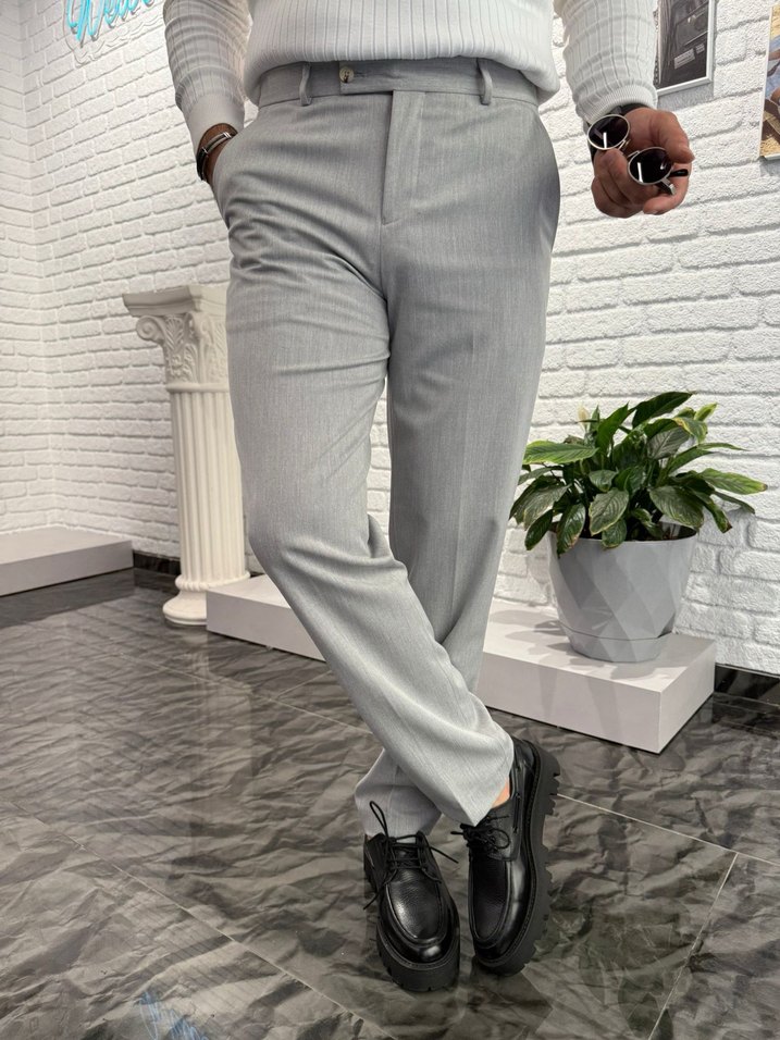 Gri renkli, kemerli ve regular fit erkek pantolon. Sentetik kumaştan üretilmiş, normal boyda ve desen içermeyen tasarımıyla ofis ve sokak stiline uyum sağlar.