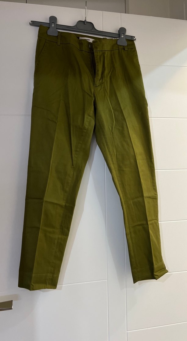 Parlak keten kumaştan yapılmış, kemerli, regular fit ve normal uzunlukta haki renk pantolon. Günlük kullanıma uygundur.