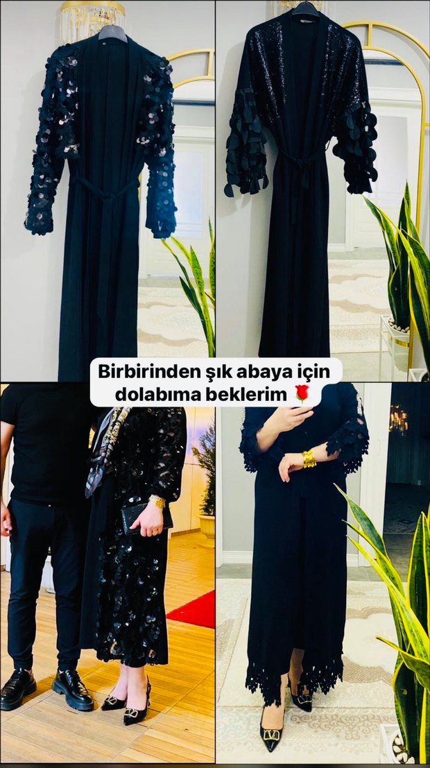 Siyah renkte, uzun kollu, yüksek yakalı ve bol kesim midi abaya. Püskül ve baskılı desen detaylarıyla düğün ve iş ortamları için uygun.