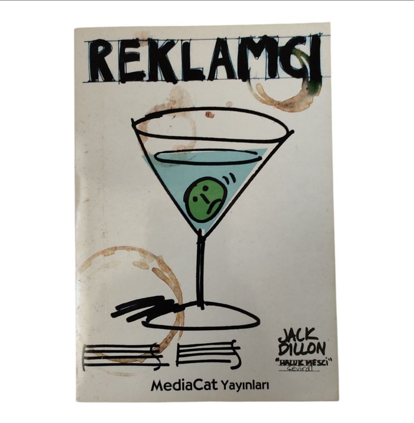 Jack Dillon imzalı "Reklamcı" mizah kitabı, MediaCat Yayınları tarafından yayımlanmıştır. Kapakta kokteyl bardağı çizimi ve eğlenceli lekeler yer alıyor.