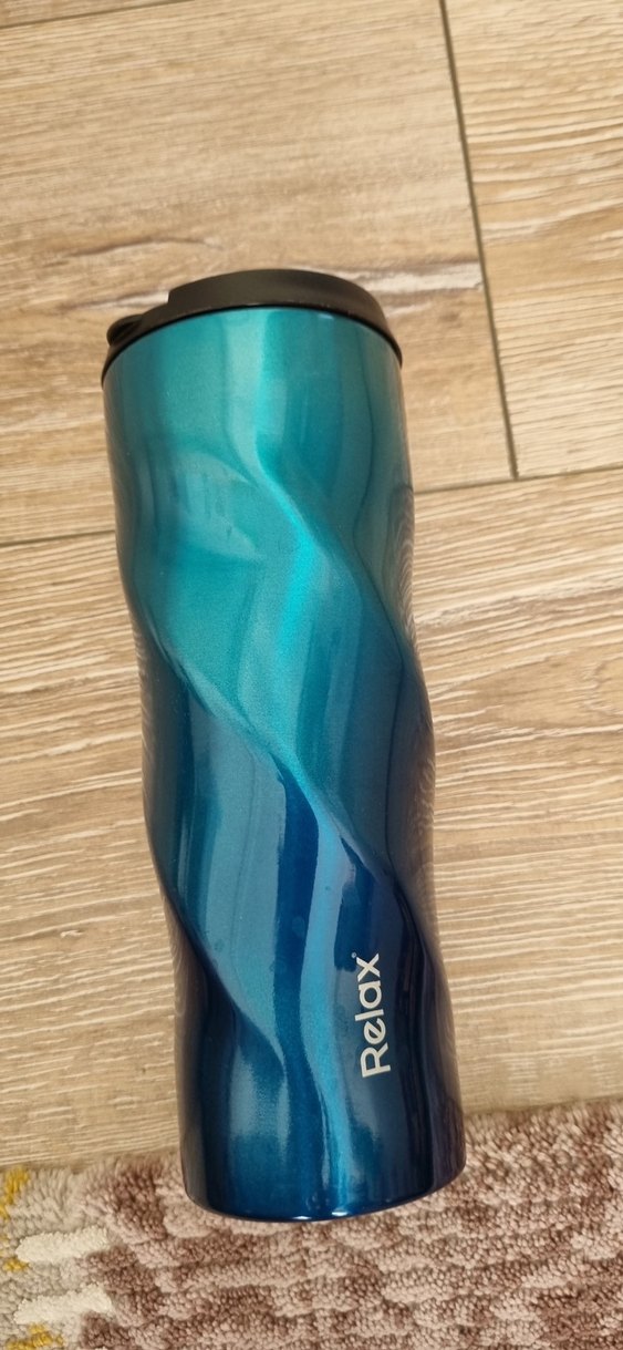 Mavi renkli, bükümlü tasarıma sahip ve üzerinde 'Relax' yazan hiç kullanılmamış termos