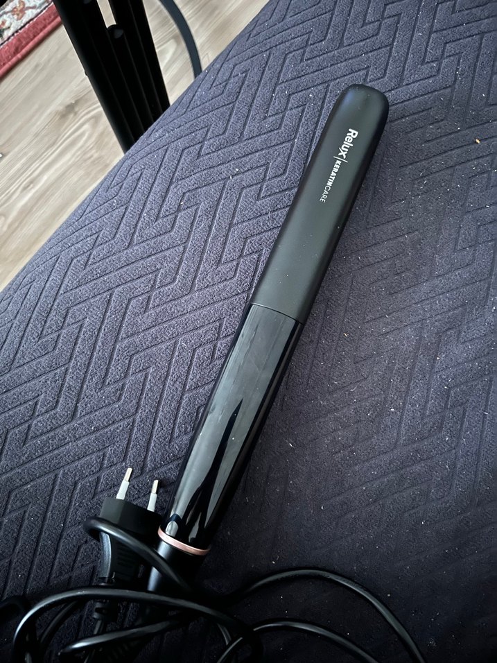 Siyah renkte, şık tasarımlı saç düzleştirici. İki uçlu fişi ve pürüzsüz yüzeyiyle saçları düzleştirmek için uygundur. ✨