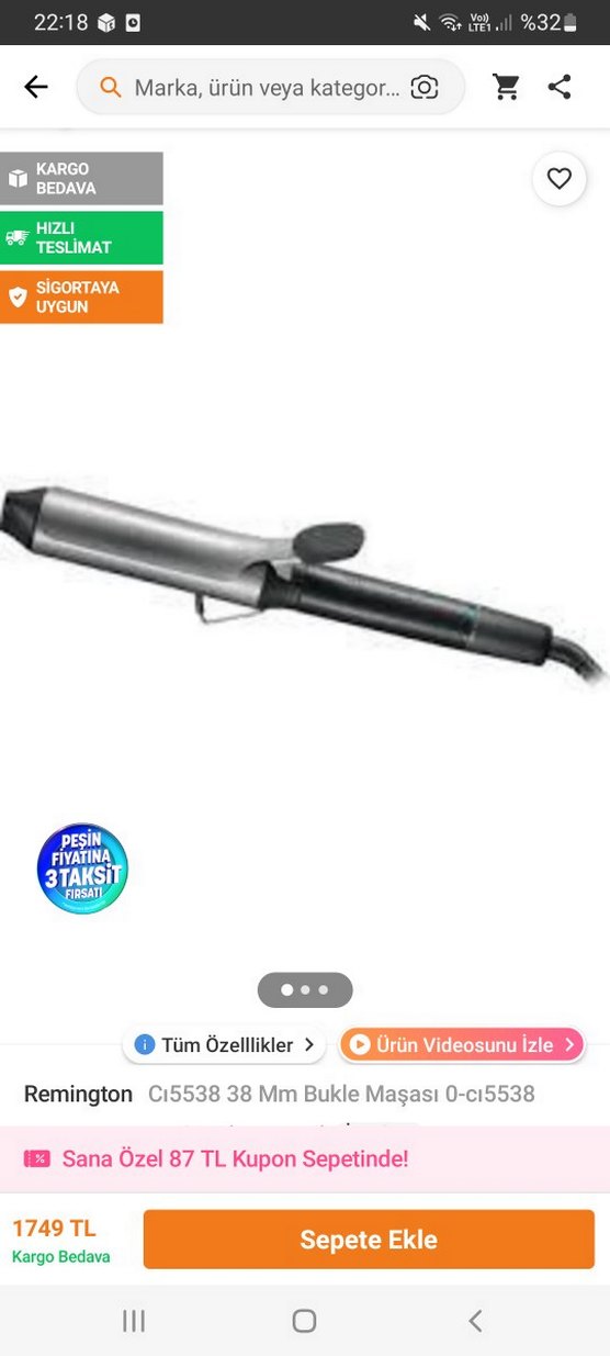 Remington 38 mm çapında gri bukle maşası, kolay kullanım ve güvenli tutuş sağlar. Sigortaya uygundur ve 3 taksit seçeneği sunar. ♀️