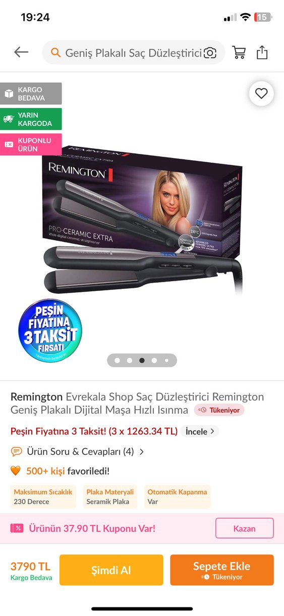 Remington saç düzleştirici, geniş seramik plakalar ve dijital 230°C sıcaklık kontrolü sunar. Hızlı ısınır ve otomatik kapanma özelliği vardır. Parlak gri renkte. ♀️