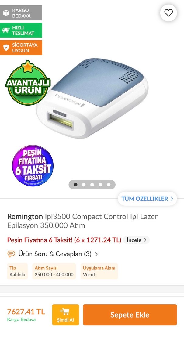 Remington Lpl3500 Compact Control lazer epilasyon cihazı, vücut için 350.000 atım sunar. Kablolu ve uzun ömürlü kullanım sağlar. neredeyse hiç kullanılmadı fiyatı uygun tuttum atışları çok iyi ve acısız bir ürün çok etkili