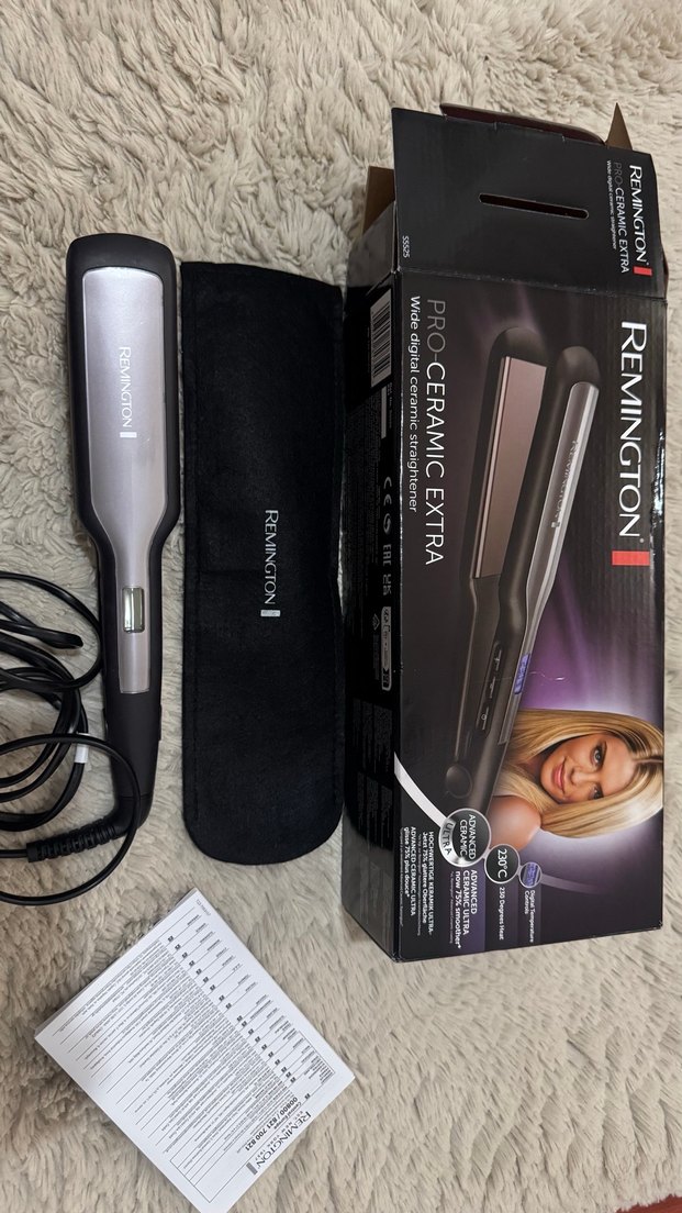 Remington Pro-Ceramic Extra saç düzleştirici, pürüzsüz seramik plakalar ve dijital sıcaklık göstergesi içerir. Isıya dayanıklı kılıf ile birlikte gelir.