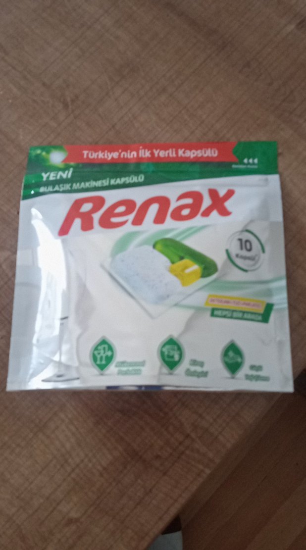 Renax bulaşık makinesi kapsülleri, 10'lu pakette, çevre dostu özellikler ve etkili temizlik sağlar.