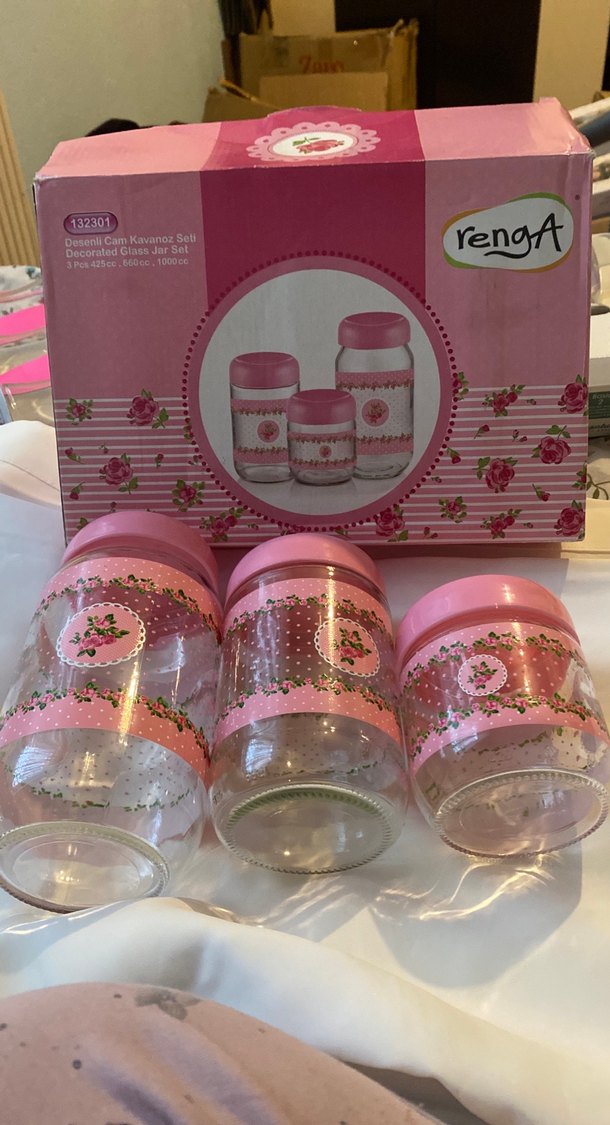 Pastel pembe renkli, çiçek desenli üç cam kavanozdan oluşan set. Her kavanozda güvenli kapak ve dekoratif tasarım bulunur.
