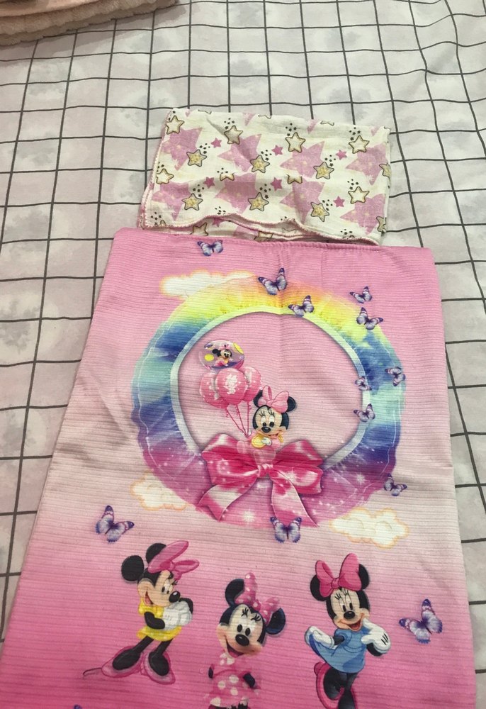 Pembe tonlarda, Minnie Mouse ve yıldız baskılı, yumuşak sentetik kumaştan rengarenk çocuk uyku aksesuarı. ️
