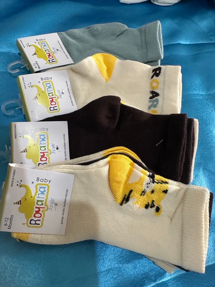 Rengarenk baskılı erkek bebek çorapları, sarı ve farklı tonlarda, eğlenceli desenler ve "ROAR" yazısı ile. Yumuşak ve rahat kumaş. 12 Li fiyatı