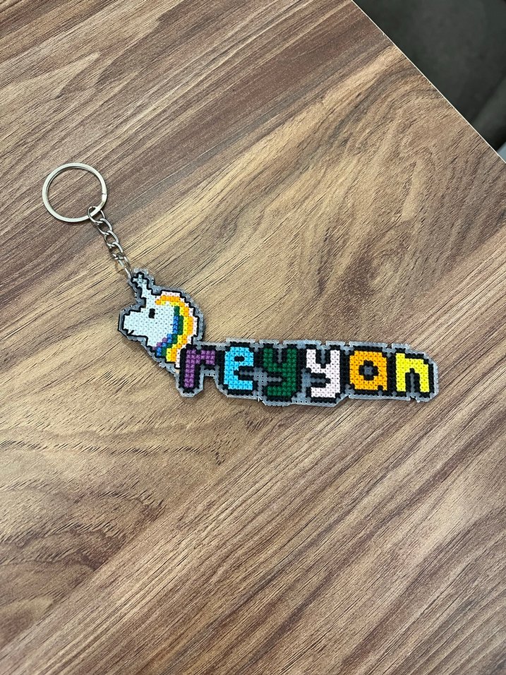 Rengarenk el işleme ile yapılmış unicorn figürlü, 'Reyyan' yazılı anahtarlık, bohem ve sokak stiline uygun. İstenilen isim ve modelde işlenir.