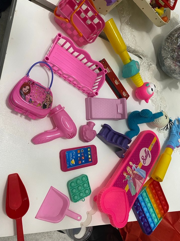 Rengarenk pembe tonlarda saç kurutma makinesi, valiz ve küçük aksesuarlar içeren oyuncak seti.