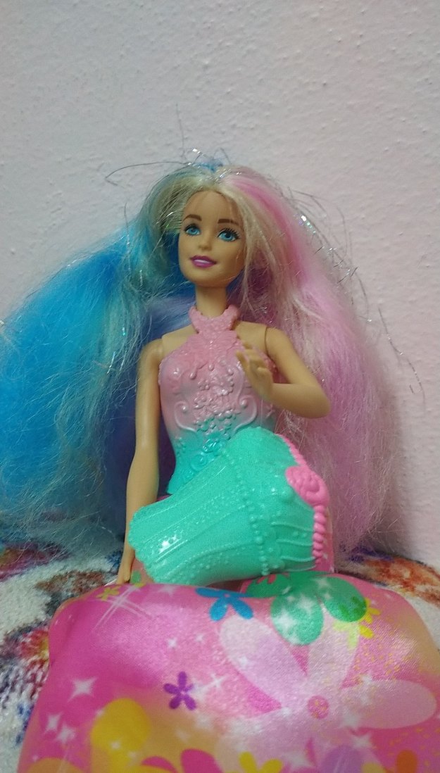 Rengarenk saçlı Barbie. İki üst kıyafeti ile birlikte.Pastel pembe ve mavi saçlı, renkli çiçek desenli elbise giymiş bebek. Detaylı üst kısmı ve canlı renkli eteği var.