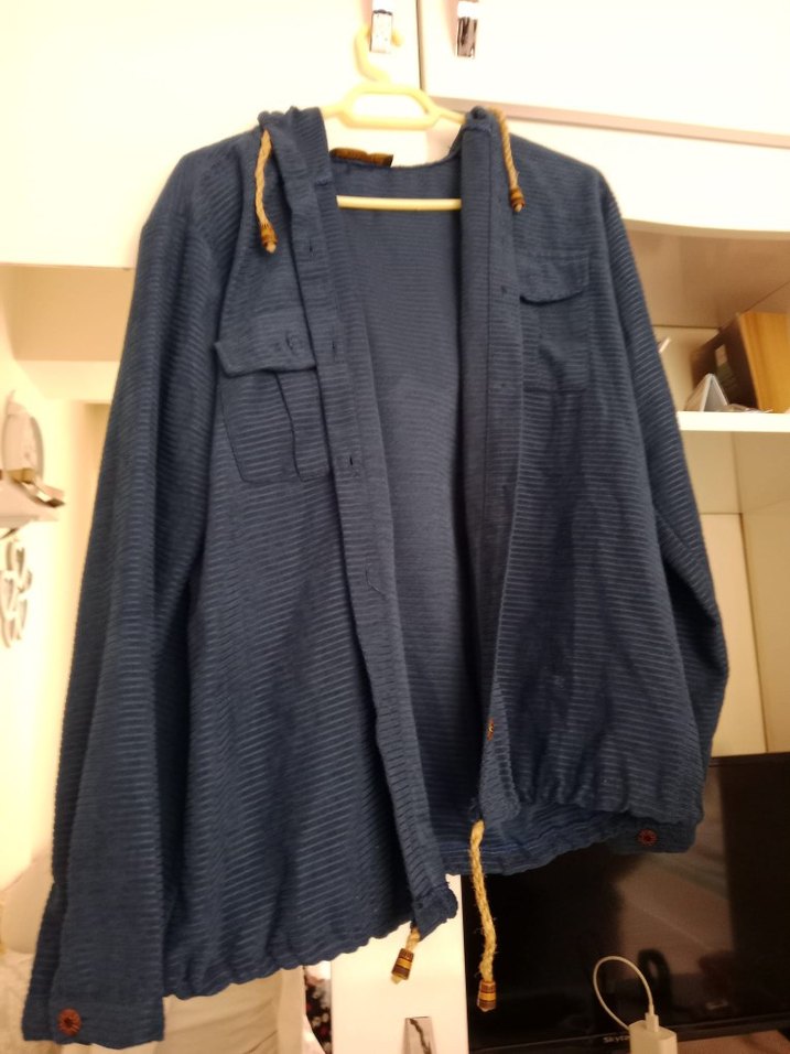 Ürünün rengi standart lacivert değildir; çok daha canlı, şık bir indigo/gece mavisi tonundadır. Fotoğraflarda dokusu tam belli oluyor, kendinden yatay çizgili ve fitilli bir kumaşı vardır. Tarz: Hem spor hem de şık (Bohem/Modern tarz). Detaylar: Kapüşonlu, hasır bağcık detaylı ve ahşap görünümlü düğmelere sahip. Göğüs kısmında çift cebi mevcuttur. Durum: Çok temiz, hiçbir defosu veya yıpranması yoktur.