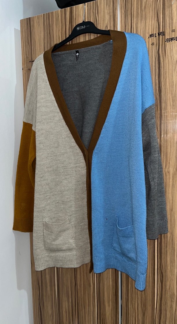 Kadın hırka, gevşek kesim, uzun kollu ve yakalıdır. Yumuşak örgü kumaştan, gri, kahverengi, bej, mavi ve hardal renk bloklu tasarıma sahiptir. Midi boy ve desensiz, bohem tarzda, günlük kullanıma uygundur. İki küçük ön ceplidir.