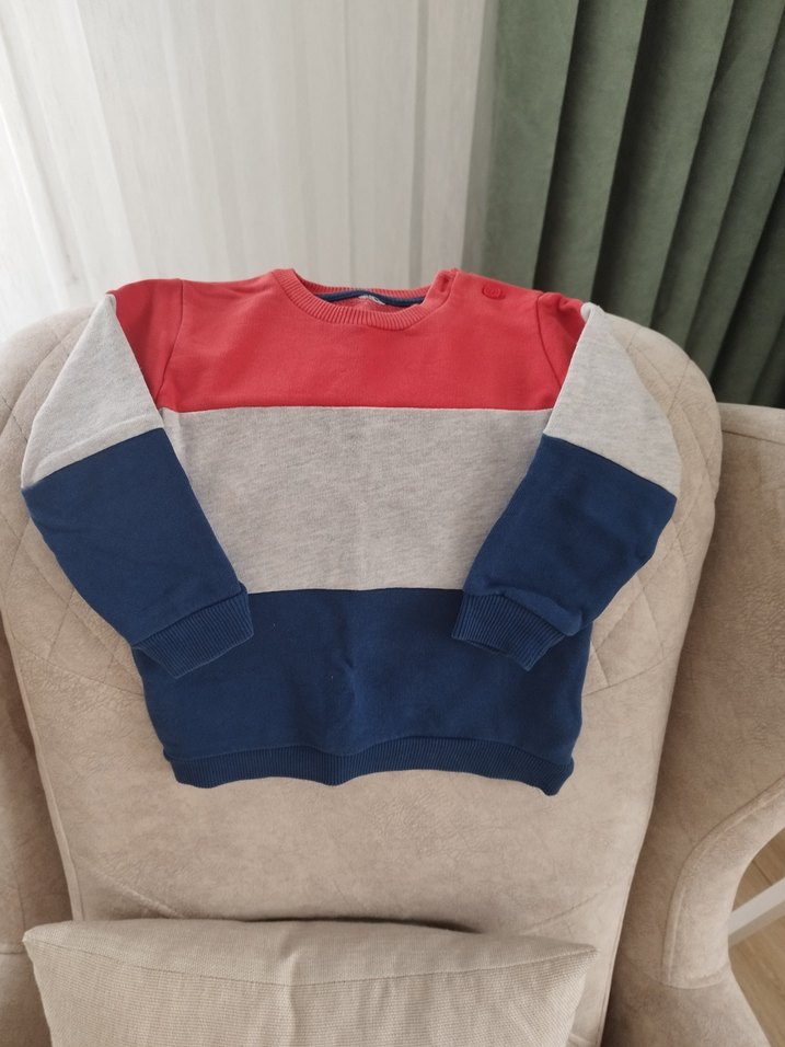Erkek çocuk sweatshirt uzun kollu ve bisiklet yaka detayına sahiptir. Yumuşak fleece kumaştan üretilmiş, bol kesim ve örme dokuludur. Kırmızı, gri ve lacivert renk blokları bulunur.