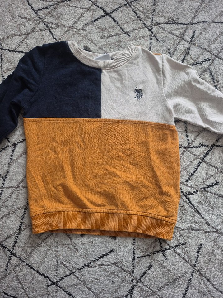 Erkek çocuk sweatshirt, uzun kollu ve yuvarlak yakalı, rahat kesim. Örgü dokusu ve koyu mavi, beyaz, sarı renk bloklarıyla küçük baskılı logo içerir. Yumuşak ve sıcak kumaş.