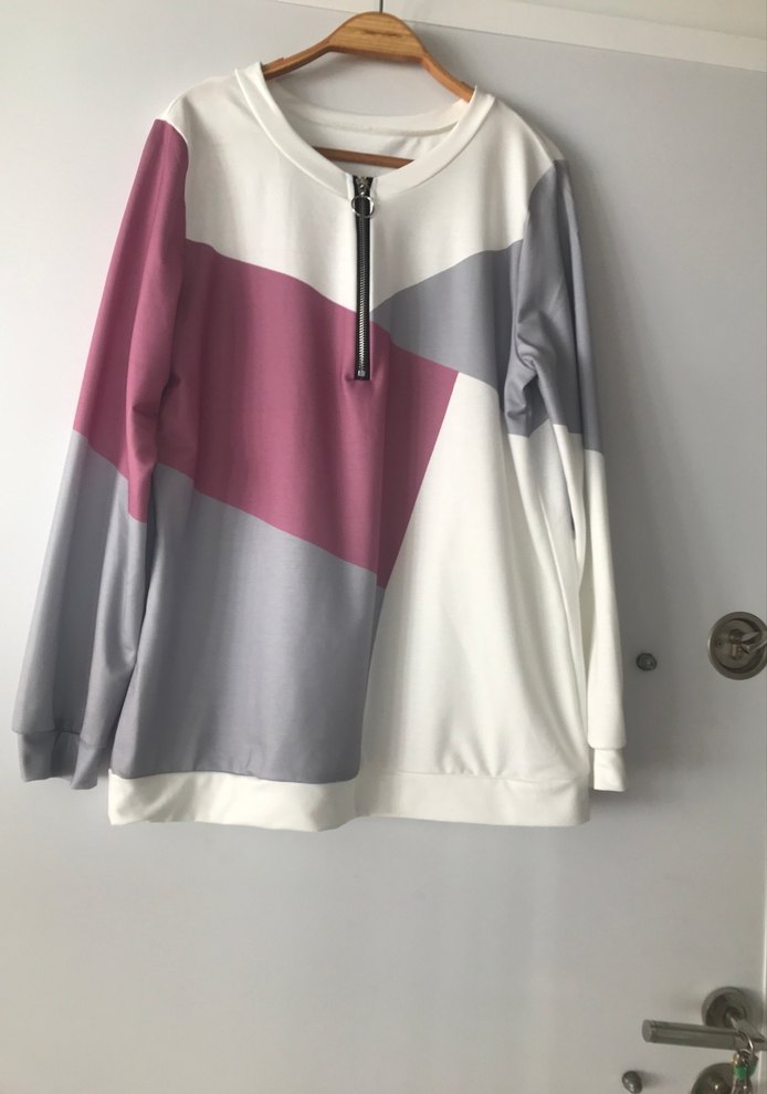 Kadın sweatshirt, uzun kollu ve yuvarlak yaka tasarıma sahip. Önünde fermuar var. Rahat kesim, pembe, gri ve beyaz renk bloklu, yumuşak sentetik kumaştan.