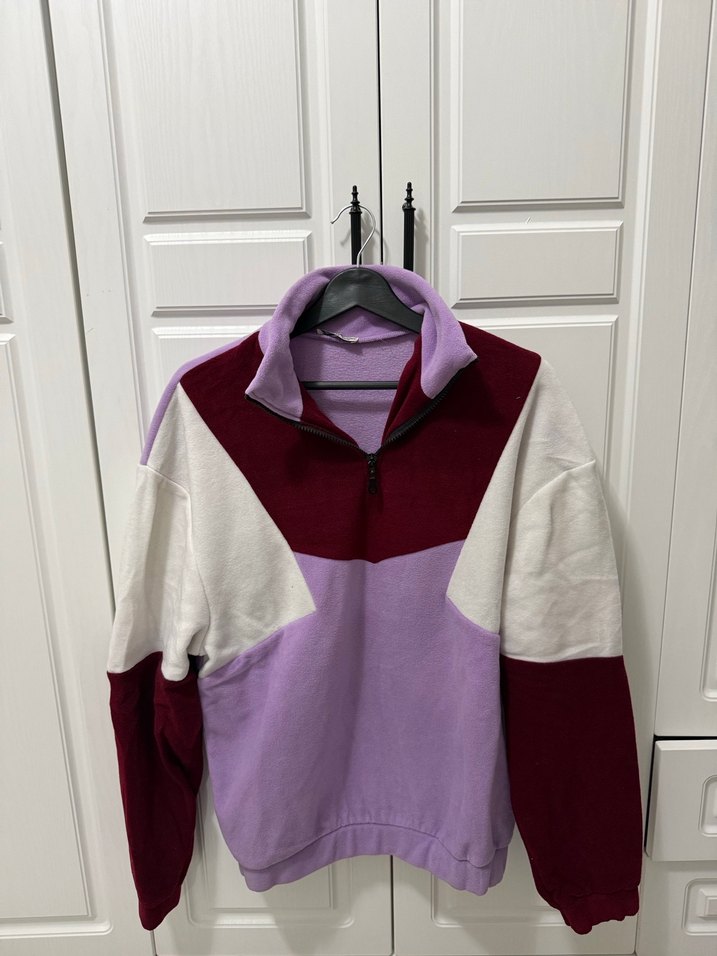 Yumuşak fleece kumaştan, yüksek yakalı ve fermuarlı kadın sweatshirt. Gevşek kesimi ve pastel mor renk bloklu tasarımıyla rahat bir sokak stili sunar.