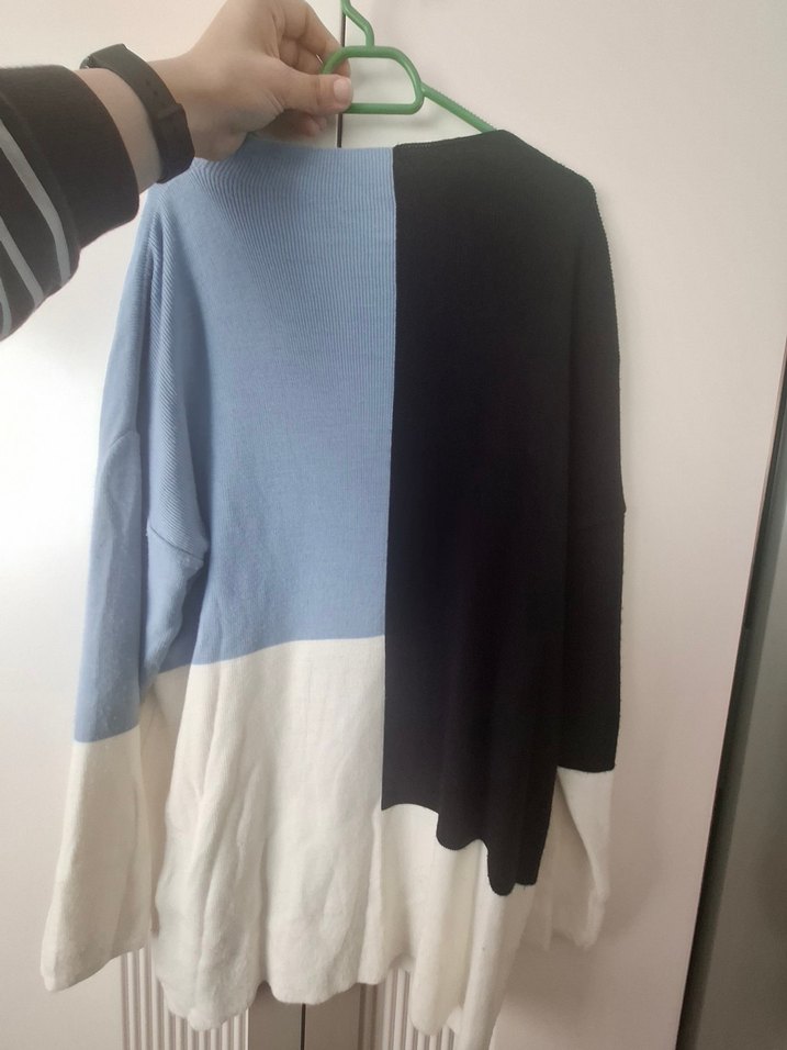 Bu triko kazak, uzun kollu ve yuvarlak yaka olup, rahat kesimlidir. Pastel mavi, siyah ve beyaz renk blokları vardır. biraz tiftiklenme var görsele ekledim