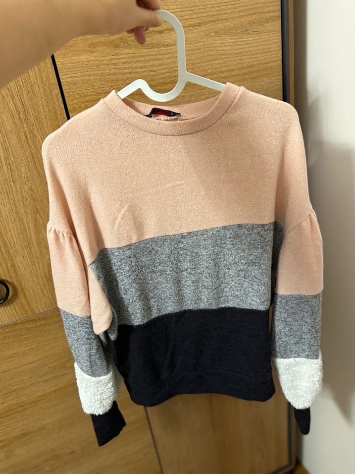 Uzun kollu, yuvarlak yaka ve pembe, gri, siyah renk bloklu kadın triko kazak. Günlük kullanıma uygun rahat kesim.