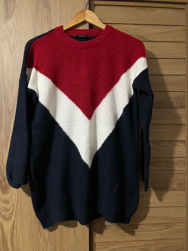 Uzun kollu, bisiklet yaka, renk bloklu triko kazak. Rahat kesimi ve koyu renkleriyle gündelik sokak stiline uygundur.