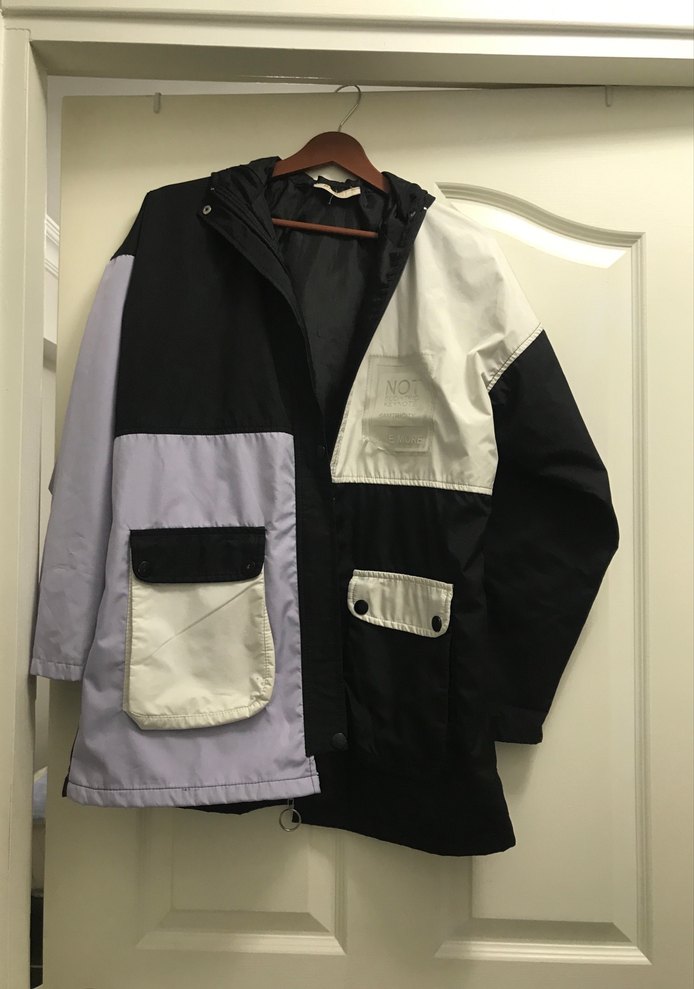 Bu kadın ceketi, düğmeli ön kısmı, uzun kollu ve bol kesimi ile dikkat çeker. Siyah, beyaz ve mor renk bloklu, büyük cepli ve kapüşonludur, sentetik kumaştan üretilmiştir.