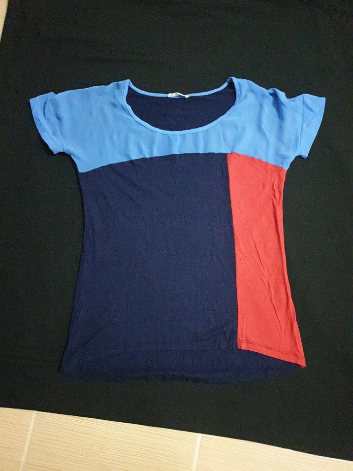 Kısa kollu, yuvarlak yakalı kadın tişörtü, rahat kesim ve normal midi boyda. Koyu mavi, açık mavi ve kırmızı renk bloklu, yumuşak sentetik kumaştan üretilmiş. Günlük sokak stili için uygun, zahmetsiz şıklık sunar.