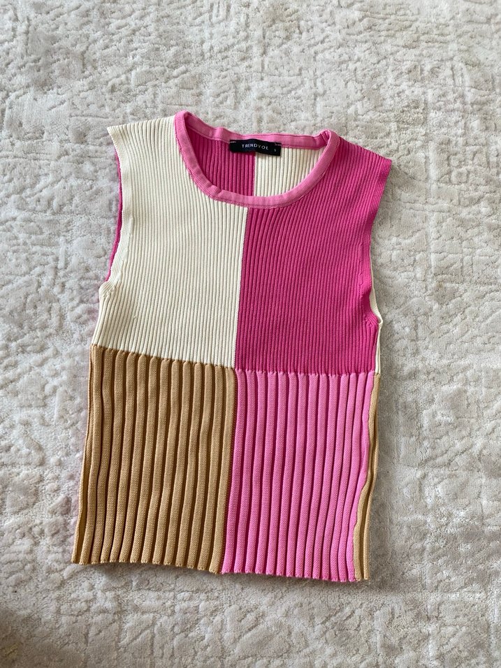 Kolsuz, kısa kesim, triko dokulu kadın süveter. Crew yaka ve pastel renk bloklarıyla günlük rahat kullanıma uygun.