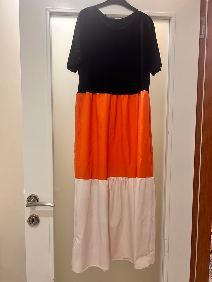 Siyah, turuncu ve beyaz renk bloklu, piliseli uzun elbise. Kısa kollu, yuvarlak yakalı ve sentetik kumaştan, rahat sokak stili için uygun. Herhangi bir sorunu yoktur kullanmadığım için uygun