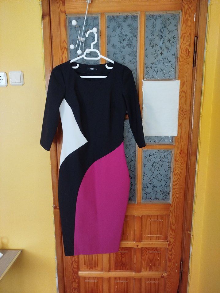 V yaka ve üç çeyrek kollu, renk bloklu uzun kalem elbise, ofis için uygun şık bir tercih.