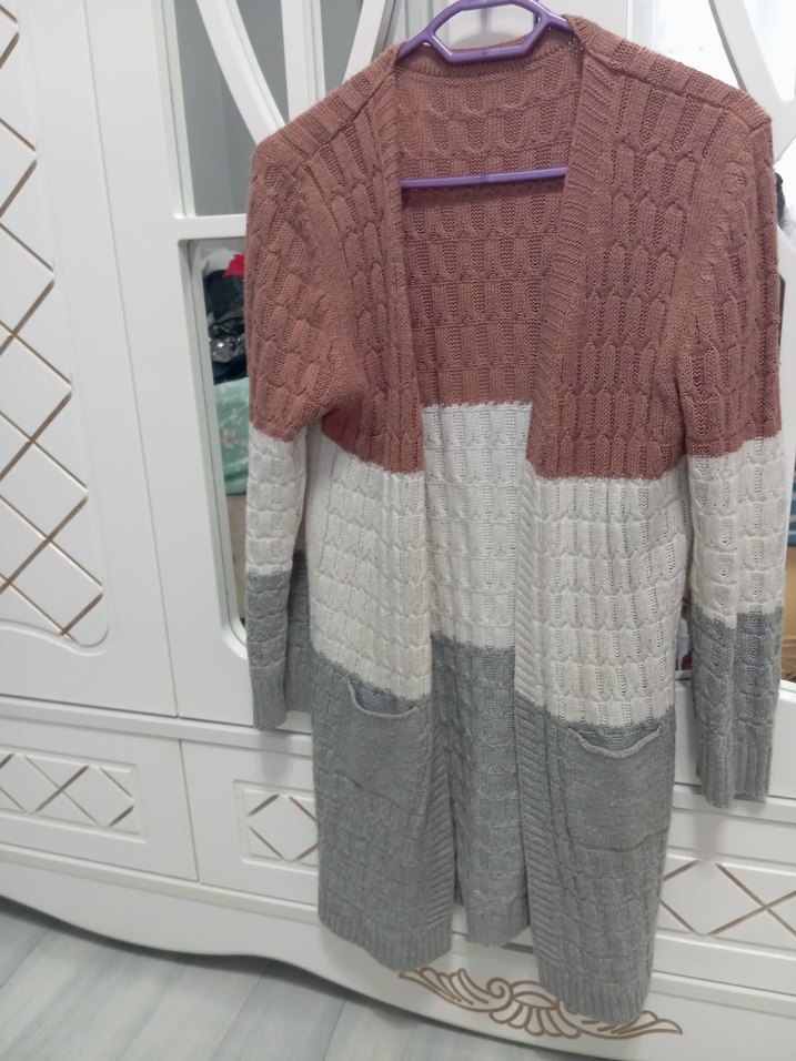 Toz pembe, krem ve gri renk bloklu uzun örgü hırka. Rahat kesim, uzun kollu ve cep detaylı, günlük kullanım için uygundur.