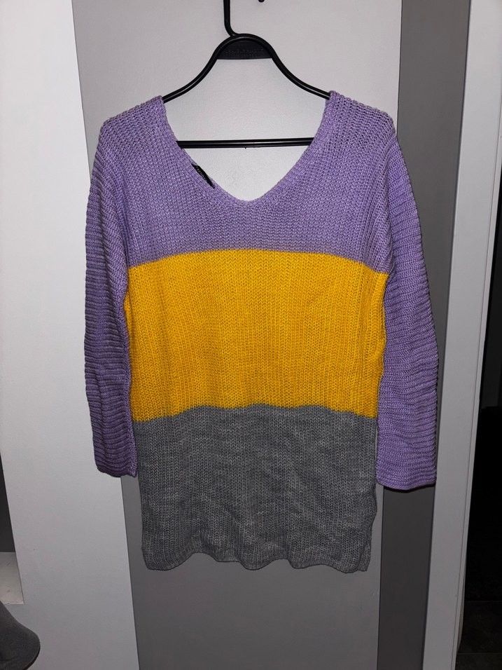 V yakalı, uzun kollu ve bol kesimli bu triko kazak, mor, sarı ve gri renk bloklarından oluşur. Günlük kullanıma uygun rahat bir stildir. S/m beden için uygundur
