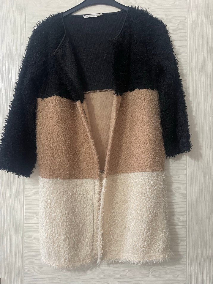 Siyah, kahverengi ve beyaz renk bloklu, yumuşak tüylü detaylara sahip kadın hırka . Uzun kollu, bol kesim ve midi boyda, günlük kullanıma uygun. S-M uyumludur