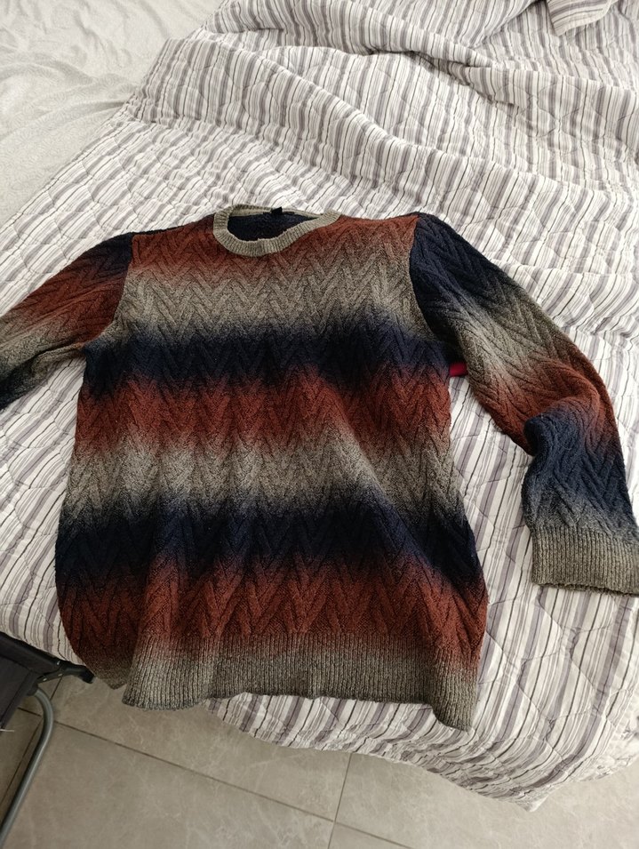 Bu kadın kazak, kahverengi, gri ve siyah tonlarda renk geçişli örgü kumaşa sahiptir. Salaş kesim, uzun kollu ve yuvarlak yakalıdır, günlük kullanım için uygundur.